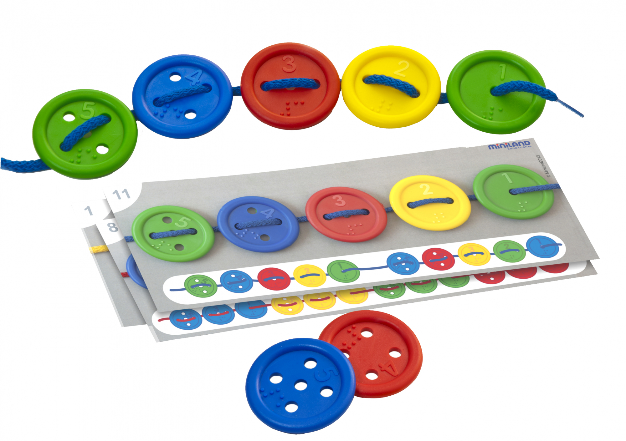 Развивающий набор для шнурования. Игра представляет собой набор из крупных цветных пуговиц и шнуров. На каждой пуговице изображено число и его эквивалент в виде Брайлевского символа.