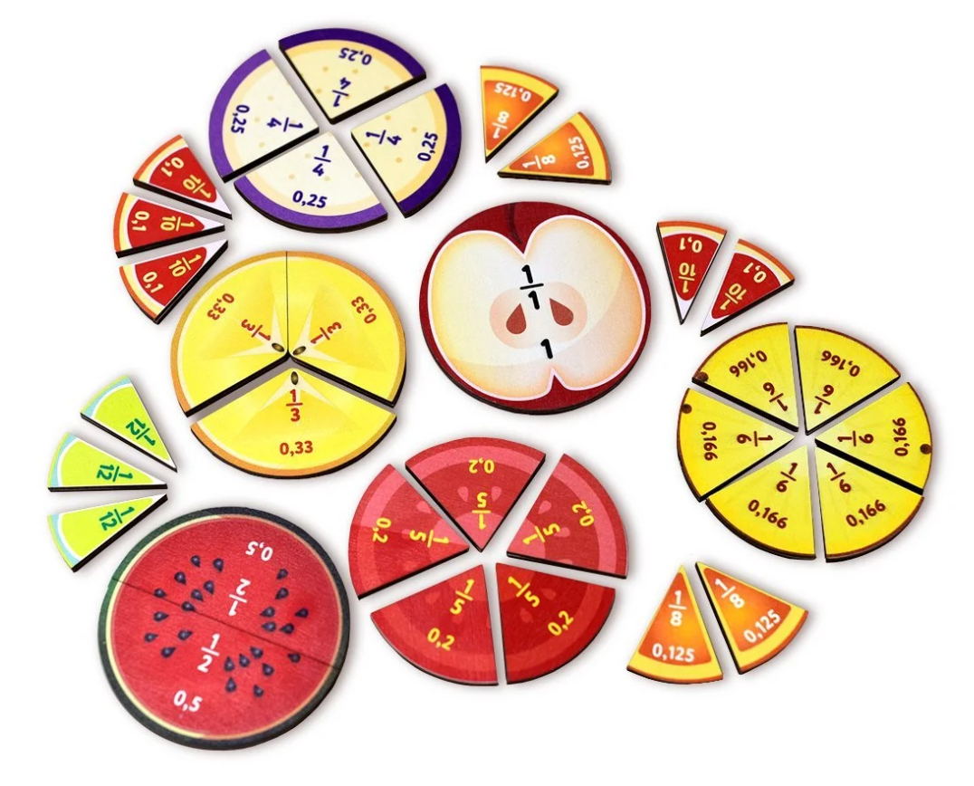 Каждый слой состоит из определенного количества частей (2,3,4,5,6 и т.д.). Это помогает детям на наглядном примере не просто понять принцип дробей, но и изучить соотношение 1/3 и 1/6, 1/2 и 1/10.