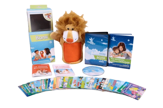Комплектность: 30 специальных сказок для семи черт воли; лев-сказочник (кукла-рукавичка); книга "Как воспитать ребенка сильным"; аудио-диск с записью сказок.