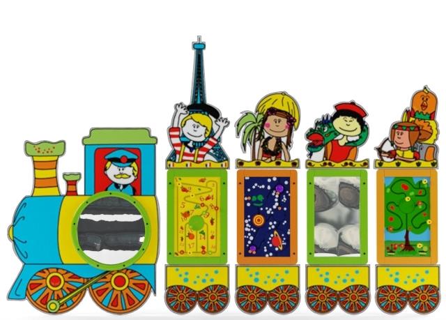 Игровую систему можно собрать в нужном Вам размере из одиночных элементов и игровых модулей: паровоза и вагонов с изображением стран, в которые детям предлагается совершить вымышленное путешествие.