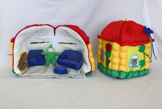 Раскрыв домик, мы попадаем в квартиру, где на окнах красивые занавески, у дверей лежит коврик, чтобы гости смогли вытереть обувь, стоит вешалка для одежды. Ждет гостей гномик в колпачке с бубенчиком. Он расположился в мягком кресле, оставив для своих друзей диванчик с подушками. При желании можно «видоизменять» мебель, спинки у дивана и у кресла отстегиваются.