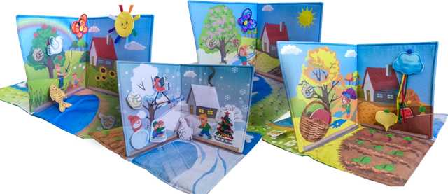 Разделена на 4 зоны: зима, весна, лето, осень. Все это дополнено навесными элементами (яблоко, солнышко, бабочка, цветы, птичка, грибы, овощи: капуста, морковь, свекла, картофель, игрушки: лопатка, ведерко с песком, тучка, утка, утята) для более интересной игры.
