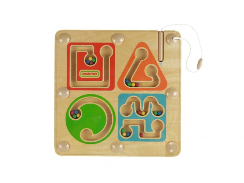 Панель выполнена из березовой фанеры, на лицевой части которой расположен деревянный магнитный лабиринт с 4 дорожками различной геометрической формы в 4 разных цветах.