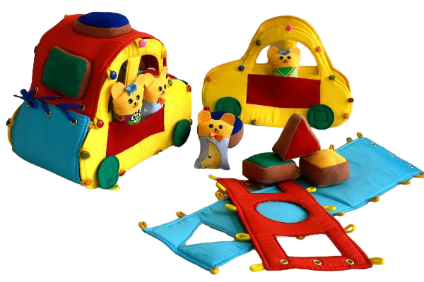 У машинки есть колеса, они крепятся на липучку, два пассажира в специальном кармашке, шнуровка – багажник. Кроме того, на прямоугольниках сделаны отверстия разной геометрической формы и разноцветные вкладыши - пуфики к ним.