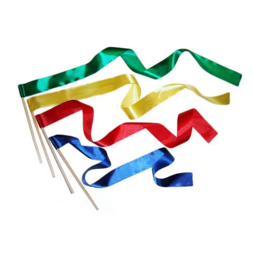 Атласные ленты разных цветов на деревянных палочках способствуют развитию тонкой и сложной мышечной координации и художественному воспитанию ребенка.
