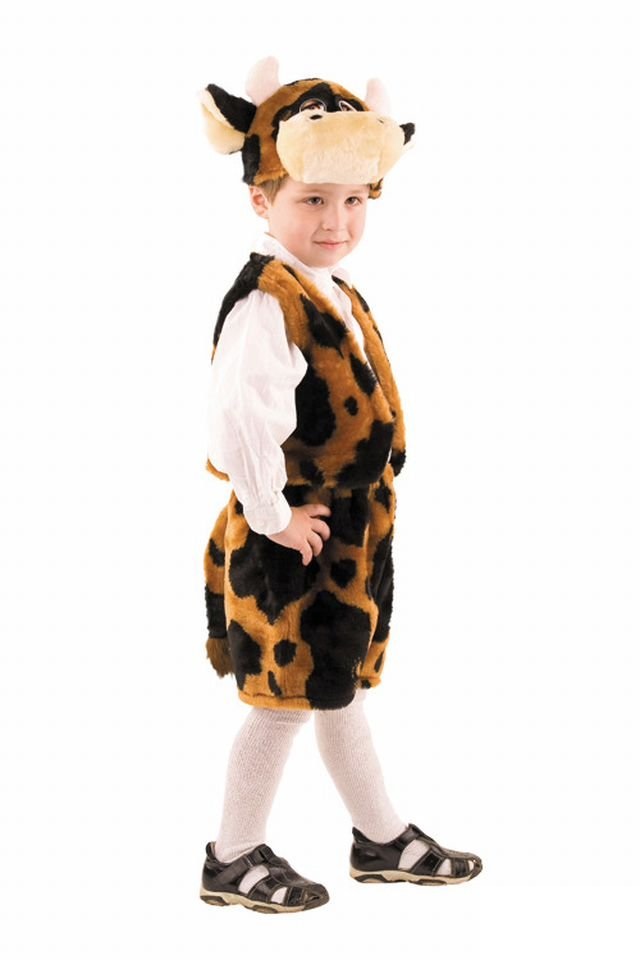 Костюм бычка имеет коричнево-черный пятнистый окрас, который присутствует и на маске-шапочке, и на жилетке и на шортиках.