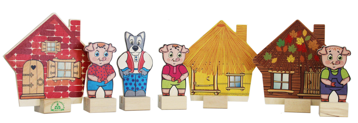 Деревянные фигурки героев сказки «Три поросенка» позволят детишкам самим создать спектакль и разыграть сказочную постановку с одноименным названием.